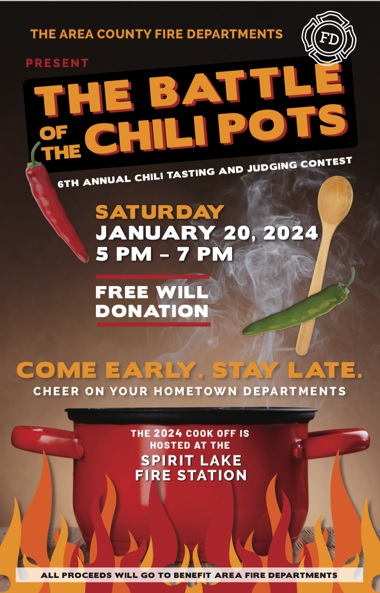 (Spirit Lake)– An annual fundraising event for lakes area fire departments will be going on this weekend. Jason Simpson of the Milford Fire Department says the 6th annual “Battle of The Chili Pots” will take place this Saturday, January 20th, from 5:00 until 7:00 pm at the Spirit Lake Fire Station. He says those attending […]