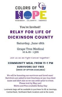 Relay for Life of Dickinson County to be held June 18 at Grape Tree Medical in North Milford