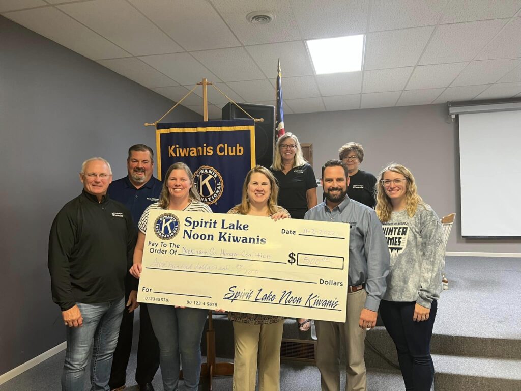 The Spirit Lake Noon Kiwanis Club recently donated $1,500 to Upper Des Moines Opportunity of Dickinson County and the Hunger Coalition of Dickinson County. The money will be used to purchase items for families to prepare and enjoy a Thanksgiving meal.